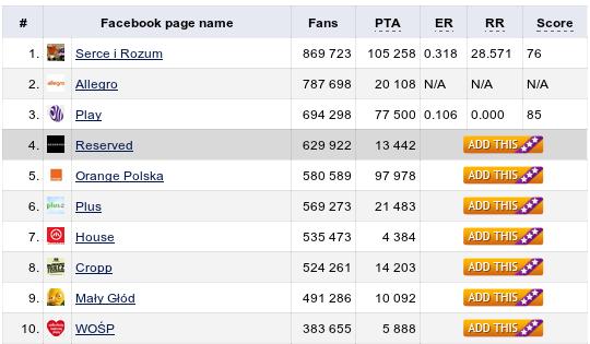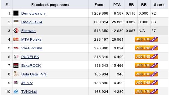 Największą popularnością wśród profili mediowych mogą się pochwalić Demotywatory, które zgromadziły 1,28 miliona fanów, odsadzając tym samym konkurentów – zajmujące drugie miejsce Radio ESKA ma 603 tysiące fanów, kolejny na liście Filmweb niemal 100 tysięcy mniej. Bardziej wyrównana sytuacja jest wśród profili marek, gdzie prowadzi Serce i Rozum (789 tysięcy fanów), goniony przez Allegro (781 tysięcy fanów), Play (657 tys.), Reserved (623 tys.) i Orange Polska (558 tys.).